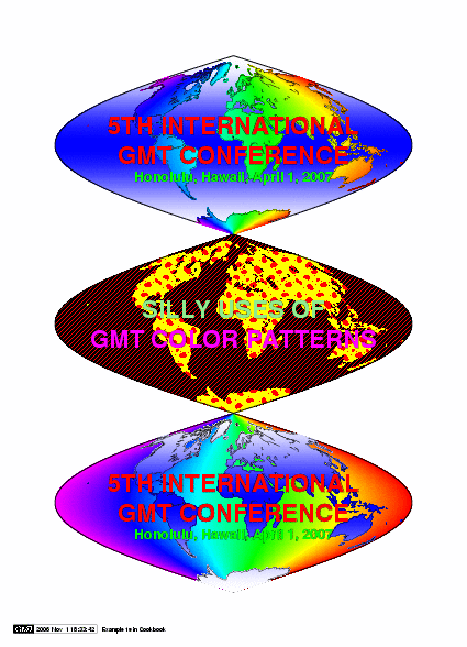 Example 19. This example illustrates that we can make GMT to color patterns in two ways: (1) set up coastline (or other) clippaths and then use grdimage to display an image inside the path, or (2) colorizing any of the 90 built-in patterns.