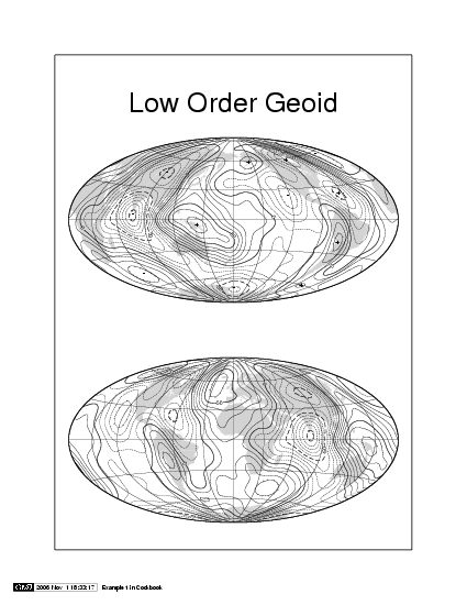 Example 1. Contour maps of the low-order geoid using a Hammer equal-area projection with shaded continents as background. The complete illustration is a superposition of 4 plots generated with the programs pscoast and grdcontour.